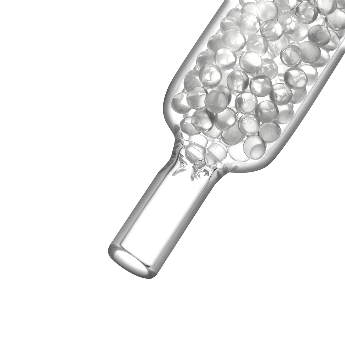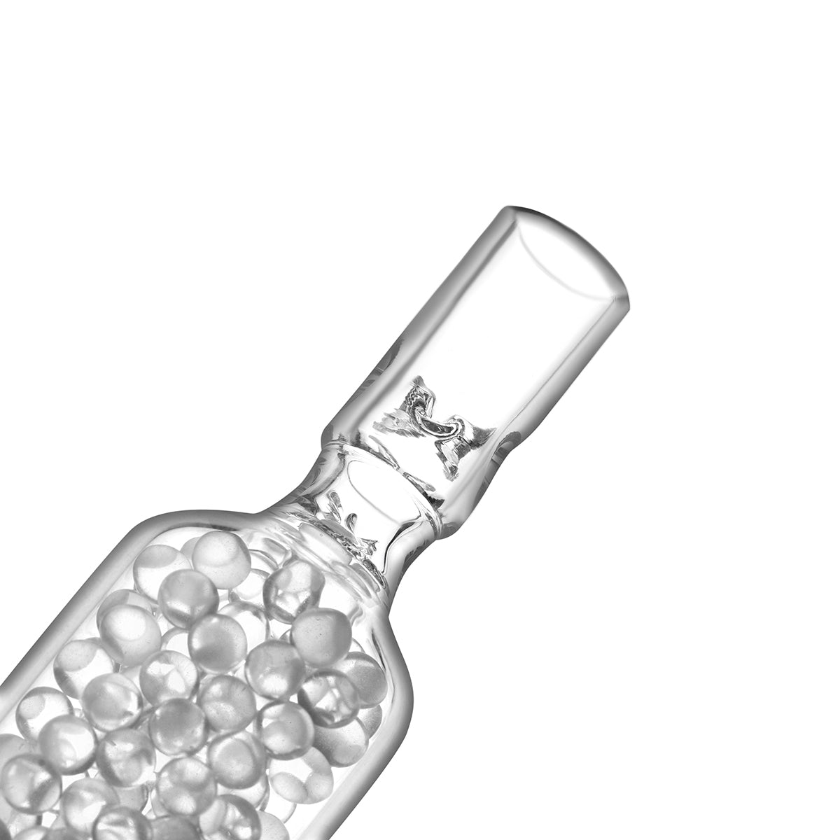 The vapor passes through hundreds of small glass beads inside the chamber. This dramatically increases surface area, allowing heat to dissipate and producing noticeably cooler vapor.